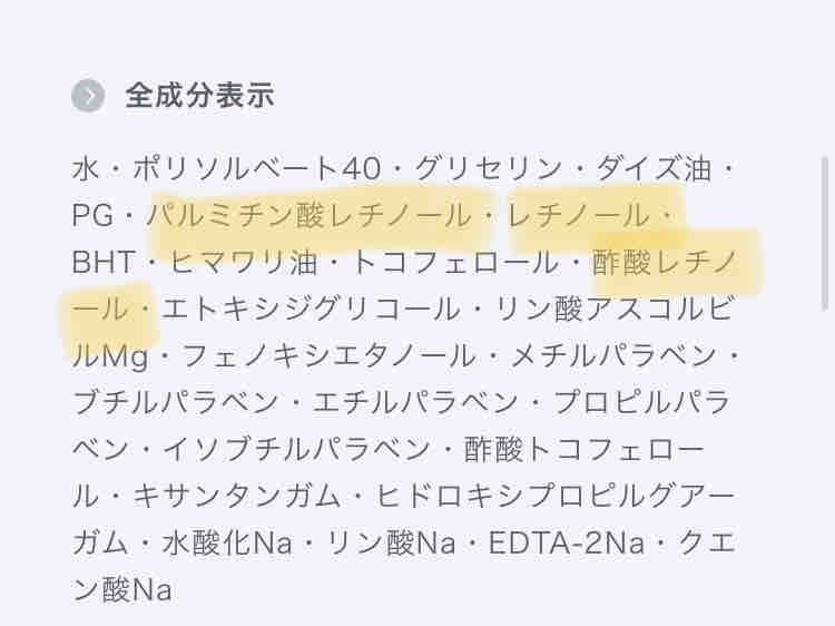 成分をみると、この中にパルミチン酸レチノール、レチノール、酢酸レチノール、3種類の異なるビタミンAか配合されていることがわかります。