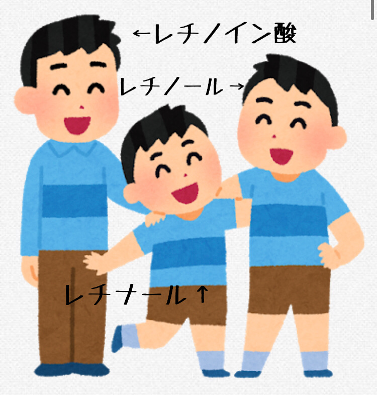 まあ三兄弟も三女神も、結局は使われるときは、最終的にはレチノイン酸の形に変換されます、ってことだけ思い出してくれたらOK🙆♀️