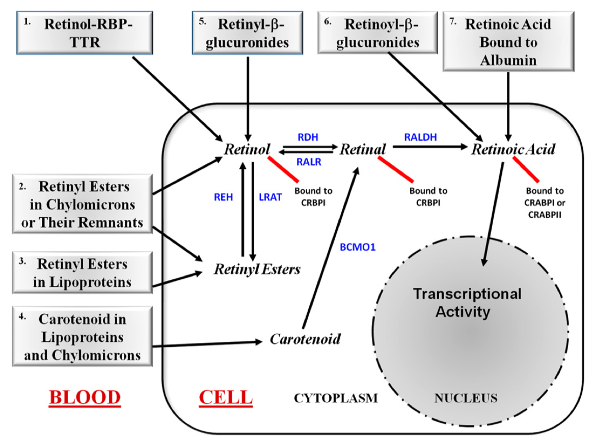 どんな形のビタミンA誘導体を入れてもとりあずはパルミチン酸レチノールの形で貯蓄されてるけど、実際使う時はそっから更に変換して、レチノイン酸ににしてから使うね~?よろしくぅ~😉❤️