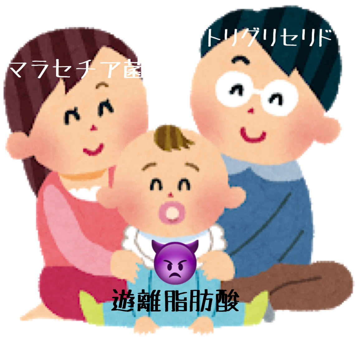 皮脂を構成している成分である、トリグリセリドくんと、このマラセチアちゃんがボーイミーツガールすることによって、副産物として「オギャー!!!」と、毛穴界のオーメン👿こと、遊離脂肪酸ベビーが生まれるというわけですね。