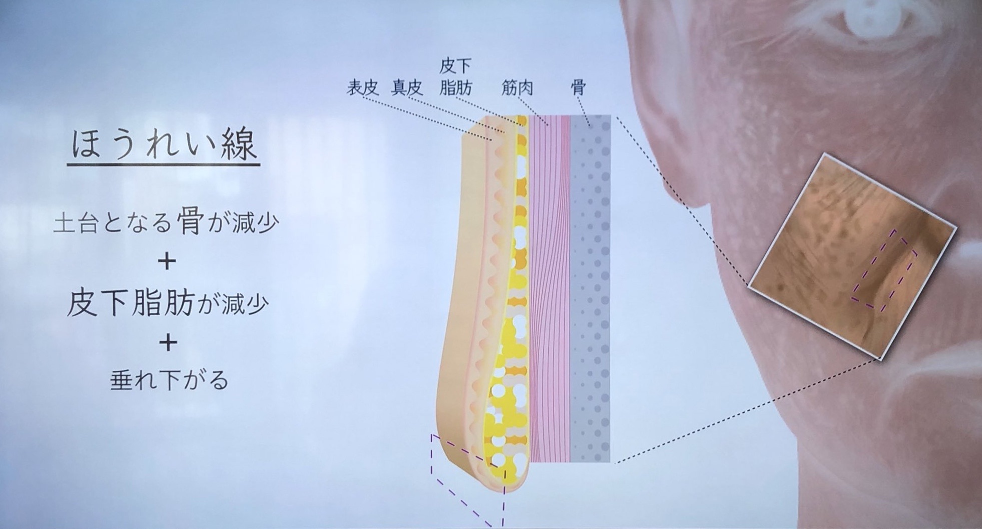 タルミって一言に言うんですが、真皮から骨までの間の全てそれぞれ劣化していきます。