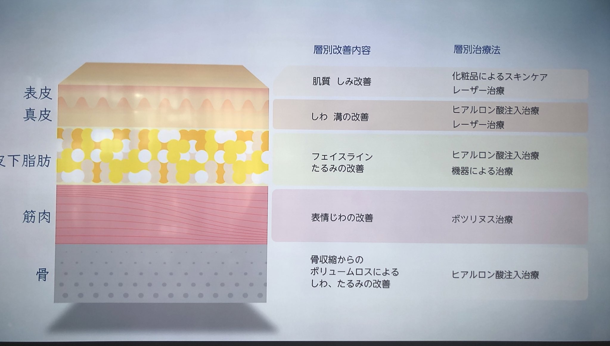 複数の層にまたがって老化が起きている以上、美容医療による施術を行う際にも、その治療がどのレイヤーにアプローチする為の物なのかを知るのは、とても大切なことです🙏