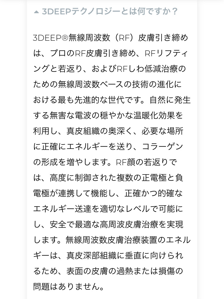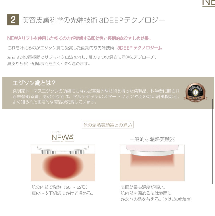 NEWAリフトは3つの電極が対になっている「3DEEPテクノロジー」によって、肌の奥まで効率よく温めが可能であると書いてあります。ただ、NEWAリフトの当て方動画を見ると分かるように、常にクルクルと動かしながら手を止めないよう、一か所に当て続けないように指導されています🙏