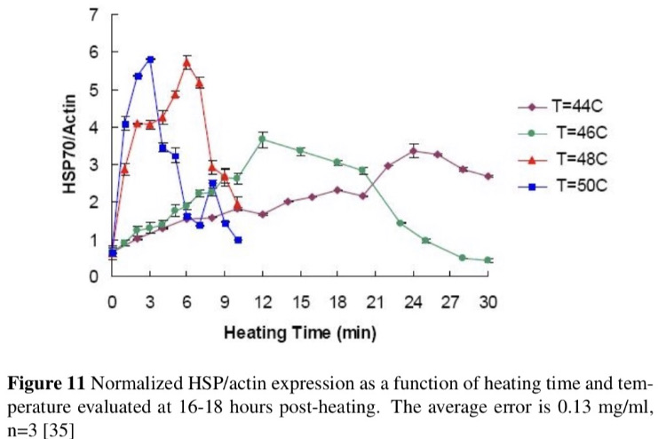 この実験によると、44℃で24分加熱したところが、一番効率よくHSPを活性化するという結果になっています✨(あくまで牛の話ですから、ヒトにこの温度が即応用可能というわけではないです⚠️)